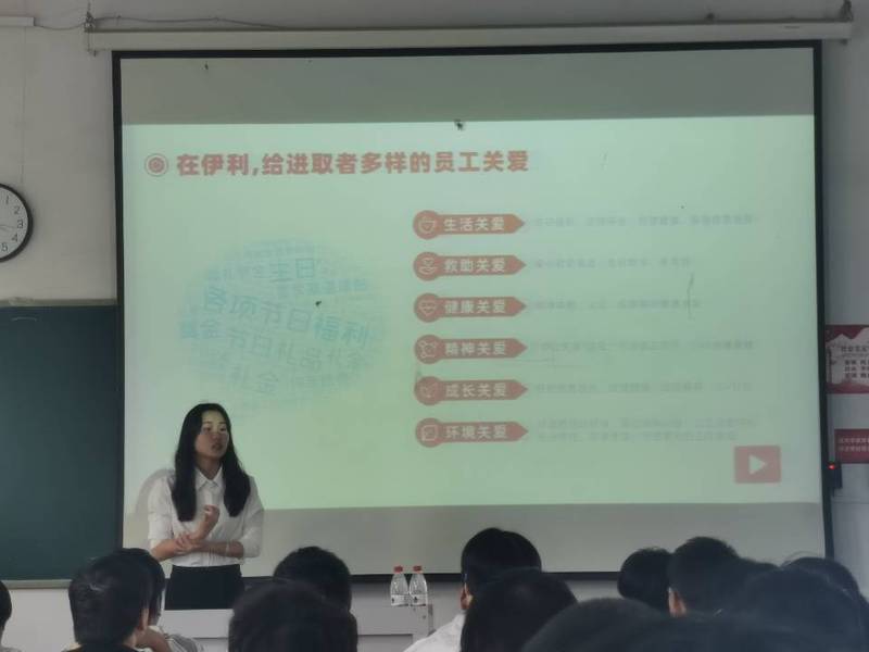宣讲伊始,湖北黄冈伊利乳业有限公司倪专员通过播放暖场视频和企业介绍视频,通过有奖提问让毕业生慢慢的减弱了陌生感,对公司开始有了亲近感。随后,该经理从企业文化、企业地位、公司优势、人才培养、就业地点等方面进行进一步的讲解,通过与学生互动提问,知识竞答等形式逐步拉进与学生关系。最后介绍了生活环境,食宿管理制度等企业情况并就大家关心的薪资待遇、福利保障和企业需求等方面重点进行介绍。