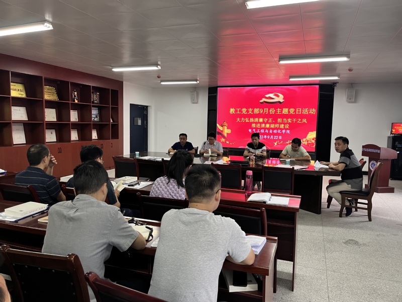 为深入学习贯彻习近平新时代中国特色社会主义思想,推进党建引领学校发展,着力促进基层党建工作提质增效,9月22日,电气学院教工党支部以“大力弘扬清廉守正、担当实干之风,推进清廉湖师建设”为主题开展9月份主题党日活动。党支部书记杨青胜同志主持会议,全体教工党员参会。
