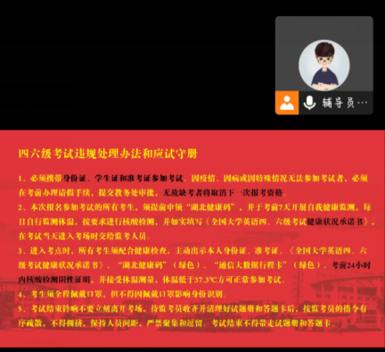 本次会议于122日晚七时在线上准时开展。辅导员黄新望围绕英语四六级违规处理办法和应试守则进行考前统一教育,他强调电气学院各参考年级的考生要在落实疫情防控的基础上进行备考并准时参加考试,要严格按照疫情防控要求进行核酸检测和体温检测并全程佩戴口罩。同时,参考学生要积极备考,严格遵守考试纪律,不得有抄袭舞弊的现象。低年级学生和未报名英语四六级考试的大二、大三学生可在进行核酸检测之后正常离校进行线上授课。随后,针对正在进行考研备考的大四学生,他鼓励学生积极备考,在最后的冲刺期鼓足干劲勇往直前,祝愿他们考出好成绩。最后,黄新望老师对各级学生提出的有关备考和离校的问题也一一进行解答。