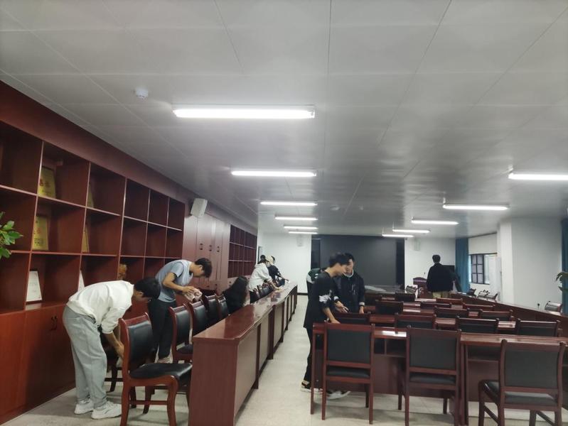 在学生第二党支部邓艺同志进行活动介绍和任务分配后,所有同志迅速参与到实践当中。按照预先分组分别对学院二级心理辅导站、档案室、大小会议室进行卫生清扫。在二楼的二级心理辅导站和档案室,同学们认真清扫地面,擦拭桌椅,洁档案缝隙间的灰尘,并完成了档案整理;在三楼的两间会议室,同学们对窗户、桌面、地面进行了全方位大扫除,会议室焕然一新。在大家共同努力和辛勤付出之下,相关办公场所卫生环境得到极大改善,得到了师生的一致好评。