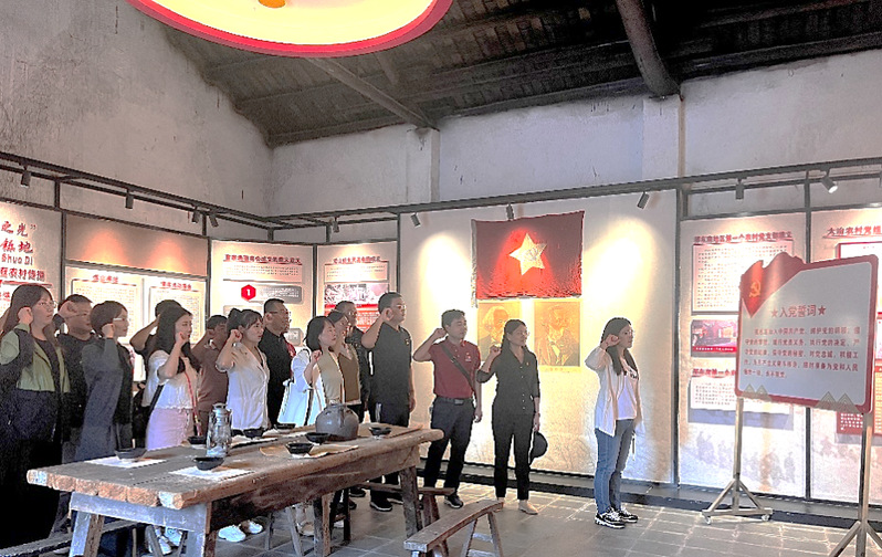 上午9时,大家到达曹家晚村“大冶中心县委”扩大联席会议旧址。“我志愿加入中国共产党,拥护党的纲领,遵守党的章程,履行党员义务……”全体党员面向党旗,举起右手庄严宣誓,一句句铿锵有力的誓言是对革命先烈英魂的致敬告慰,更是学党史、强信念、跟党走,自觉践行初心使命、主动担当作为的郑重承诺。