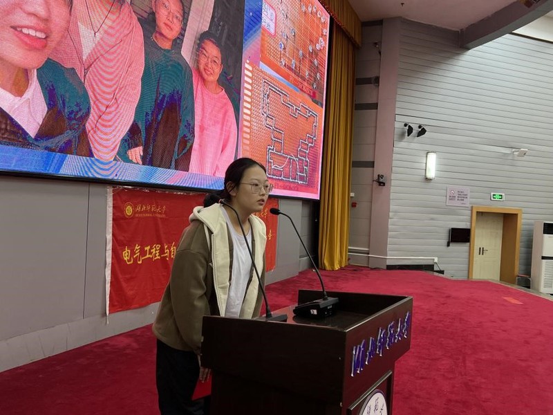 在获奖选手进行作品展示后,邓子涵作为一等奖寝室代表上台发言。在发言中,她首先表达对学院老师以及协会成员对活动的支持与帮助的感谢,同时也表明未来将秉持热爱之心,在爱好智能的道路上坚定不移地走下去。