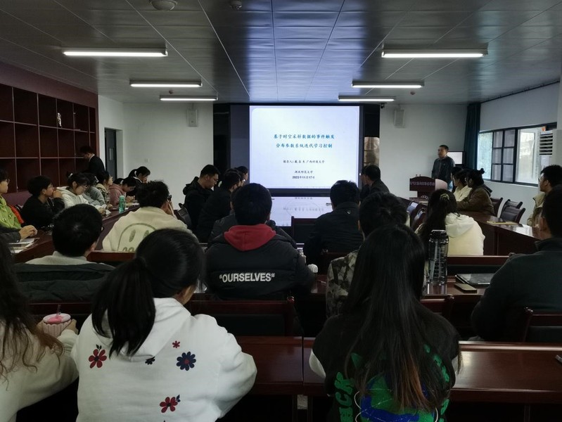 报告会上,戴喜生教授介绍了具有多项式增长的抛物分布参数系统和切换抛物分布参数系统的迭代学习控制问题;讲述了通过设计适当的触发条件和学习控制律,给出了跟踪误差在采样点收敛的充分条件;重点阐述了详细证明学习律收敛性的问题。最后,进行师生互动,戴教授为研究生答疑解惑。
