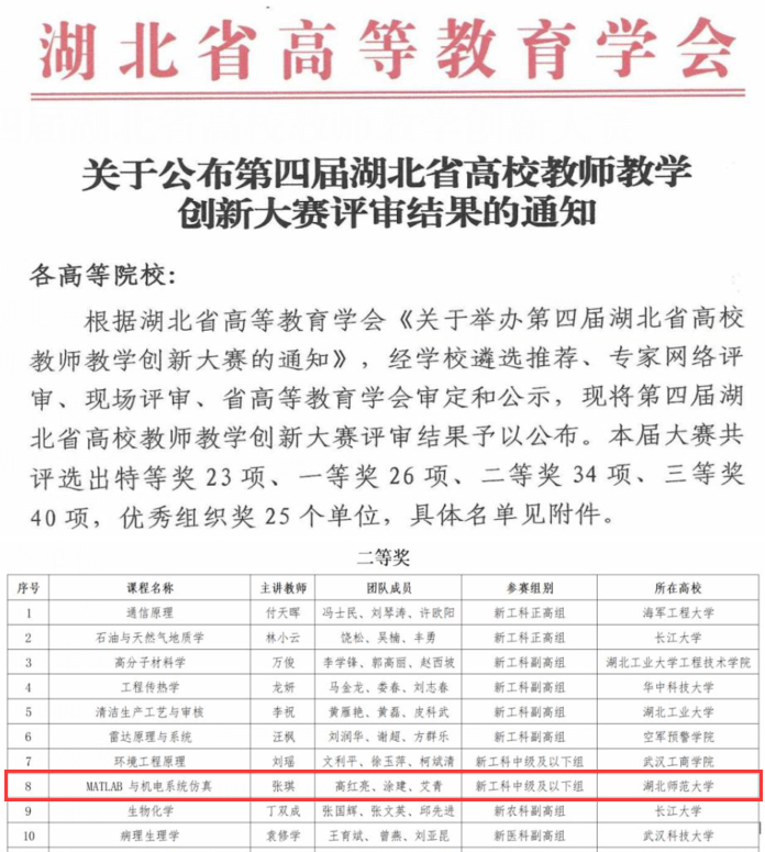 近日,由湖北省教育厅指导、湖北省高等教育学会主办、华中农业大学承办的第四届湖北省高校教师教学创新大赛圆满落幕,william英国中文教师张琪团队的《MATLAB与机电系统仿真》课程荣获新工科中级及以下组二等奖。