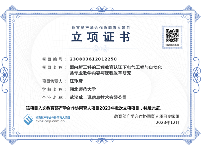 近日,教育部高等教育司公布了2023年批次教育部产学合作协同育人项目的评审结果,我院程伶俐老师主持的《通鹏科技虚拟仿真/VR仿真/MR仿真技术在教学内容和课程体系改革中的应用》、我院汪玲彦老师主持的《面向新工科的工程教育认证下电气工程与自动化类专业教学内容与课程改革研究》喜获教育部产学合作协同育人项目立项(项目编号:230710405507162、230803612012250)。