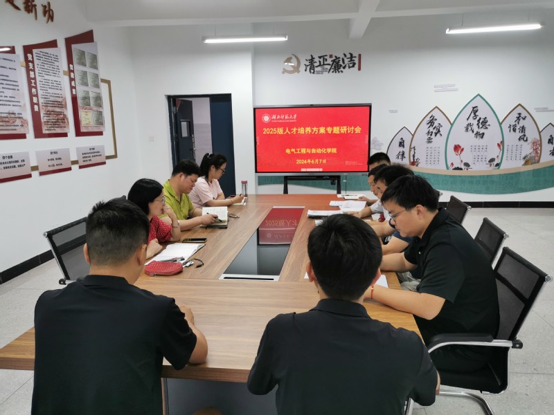 6月7日,电气学院2025版人才培养方案修订工作研讨会在24324会议室召开。参加本次会议的有院党委书记丁桂兰、院长詹习生、副书记金高辉、副院长韩涛,以及各教研室主任、相关办公室负责人。会议由副院长杨青胜主持。