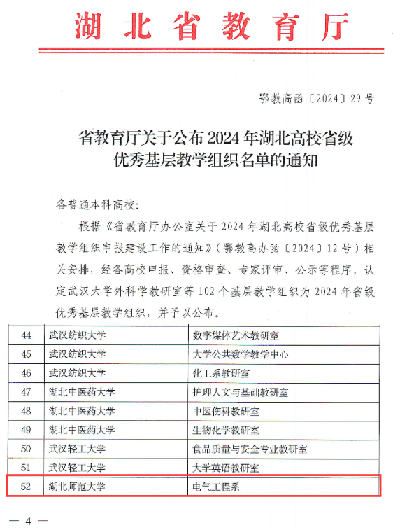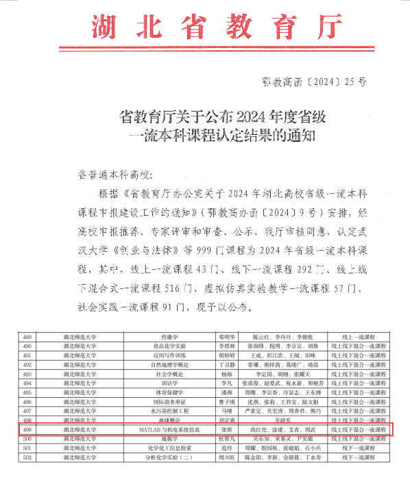 近日,湖北省教育厅先后印发了《关于公布2024年度省级一流本科课程认定结果的通知》(鄂教高函〔2024〕25号)和《关于公布2024年湖北高校省级优秀基层教学组织名单的通知》(鄂教高函〔2024〕29号),我院“MATLAB与机电系统仿真”被认定为省级线上线下混合一流课程,“电气工程系”获评湖北高校省级优秀基层教学组织。