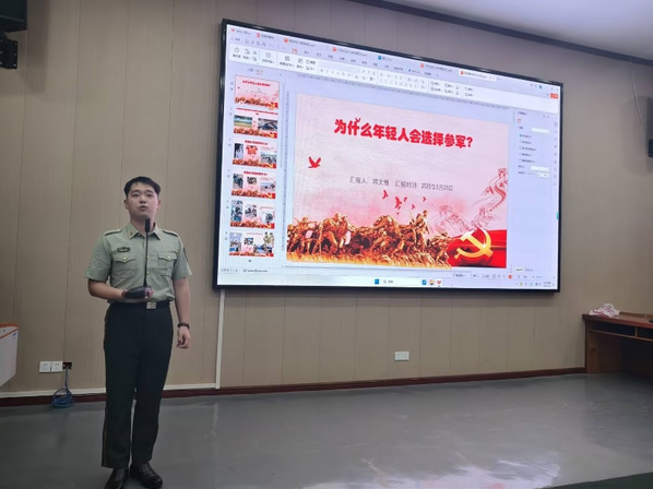 紧接着,优秀退役士兵邓文博以“年轻人为什么选择参军”为切入口,分享军营收获并给出建议;刘晓维从端正入伍动机出发,讲述入伍前、入伍时、退役后的成长经历,让学生了解参军带来的改变。