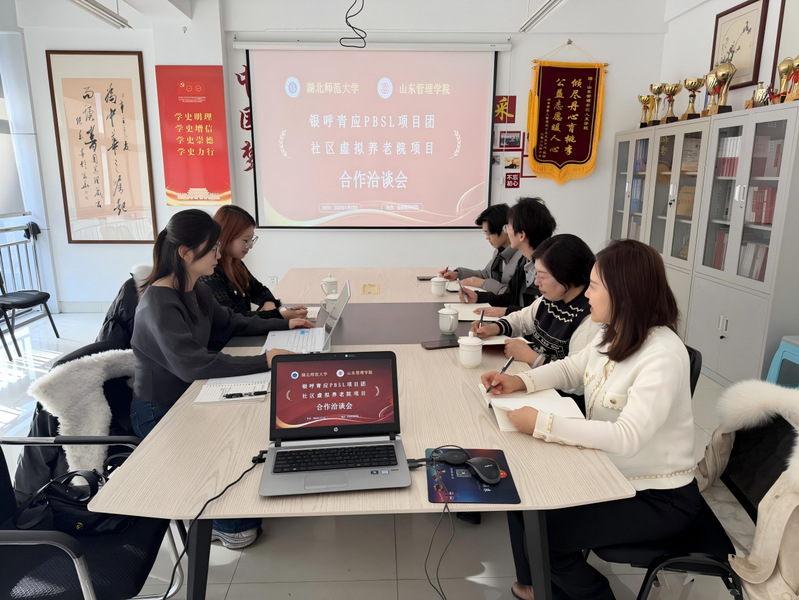 双方围绕项目内容展开了务实讨论:山东管理学院师生分享了银发时间银行理念、“商超+高校”运营模式、养老积分互换机制及引进企业资源的经验;我院项目团队系统介绍了“银呼青应”平台的设计理念与服务模式,重点展示了基于智能手环与响应平台构建的资源整合方案及MVP推进计划。通过此次交流,双方初步达成合作意向,未来将在学科竞赛协同、功能模块互补与跨区域资源共享等方面探索持续协作机制。